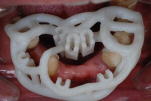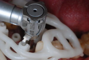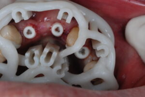 Κατά την διάρκεια της επέμβασης  , ο χειρουργικός νάρθηκας κουμπώνει στο στόμα του ασθενούς , εξασφαλίζοντας την ακριβή φορά , θέση και βάθος εισόδου των εμφυτευμάτων.